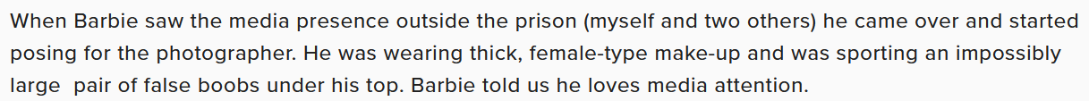 "Yeah, yeah and the reason why we refer to anybody as their chosen gender, certainly in Barbie Kardashian's case, is that they've been granted a Gender Recognition Certificate by the Department of Social Protection so, like, it's you know, we're not legally bound but it's the, you know, it is what it is. And the State recognises Barbie Kardashian as a woman and if somebody decides they want to be called a woman, like you know if you're interviewing somebody about, you know, how much they enjoy surfing or fishing, and they ask you 'can you please describe me as a woman?' And you're a bit surprised because you know you had perceived them to be possibly a man or something else, then you do that. I mean, that's just out of politeness. It doesn't really matter."