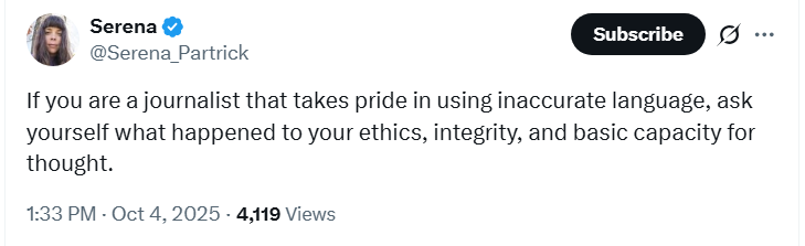 Facts matter, and the facts that journalists should be reflecting in their reportage is that no one can change sex, not with hormones or surgery nor with a paper certificate issued by the State based on an individual’s self-identifying belief. Pretending men can be women is a legal fiction which presents a safeguarding risk to women and children and is thoroughly offensive to women.