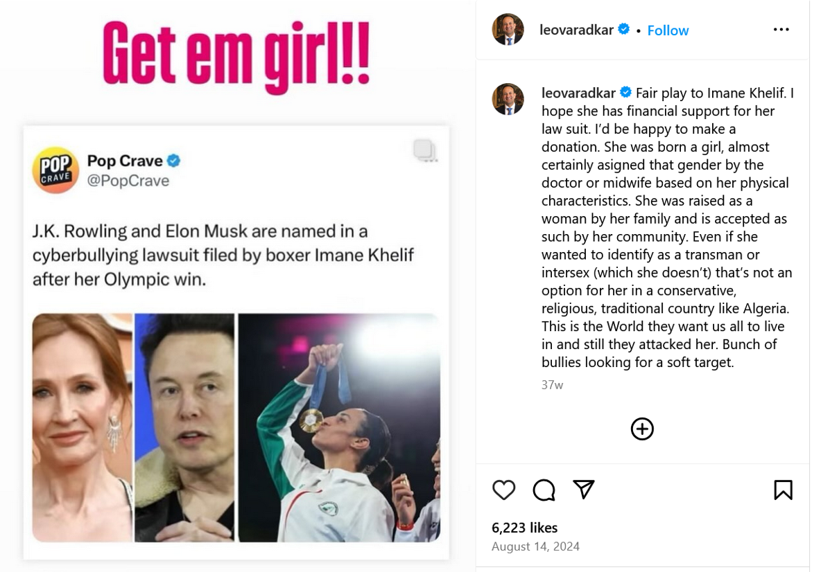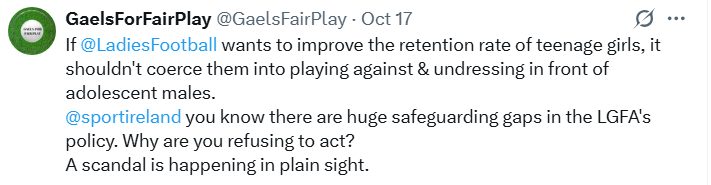 "The law as it stands does not prevent sporting bodies from creating female-only categories where female athletes — biological women — would otherwise be at a significant disadvantage..." says Varadkar: yet another admission that the GRA is creating problems for women.*