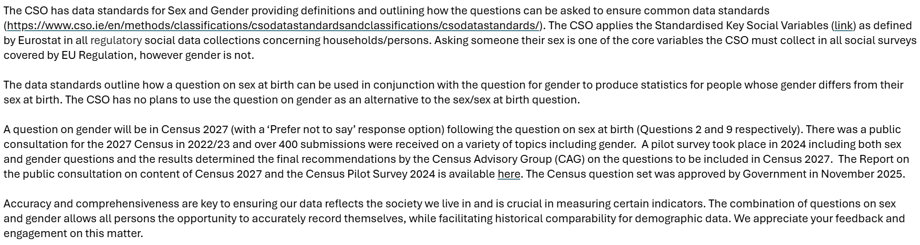 A question on "gender" (meaning gender identity) will be in Census 2027 despite the fact that the CSO says "Asking someone their sex is one of the core variables the CSO must collect in all social surveys covered by EU Regulation, however gender is not."