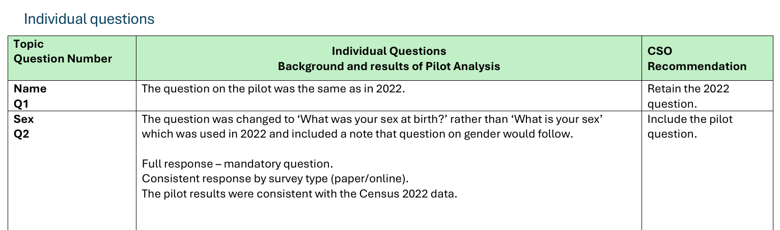 "The CSO has no plans to use the question on gender as an alternative to the sex/sex at birth question."
