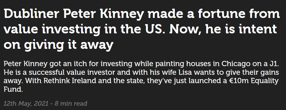 "About eleven years ago Peter Kinney and his wife Lisa Sandquist decided to set up a foundation to actively give their fortune away. Yesterday on a bright sunny morning along the River Liffey in Dublin, a mural was unveiled on the side of Liberty Hall declaring: You don’t deserve equality. It is your right.” The banner was unveiled to launch a new €10 million Equality Fund managed by Rethink Ireland, with private funding from The Peter Kinney and Lisa Sandquist Foundation matched by public funds from various government departments."