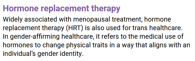 The guide is heavy on assertions but light on citing references to back these up. For example, men who "identify" as women aren't suffering from declining estrogen levels as is the case for menopausal women, so why is it called "hormone replacement therapy"?