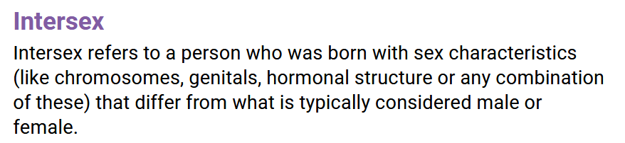 This use of the word "intersex" is typical of activist speak given that it's an outdated term for some 40+ Differences in Sex Development (DSD) which affect a tiny proportion of men and women. For instance, Klinefelter Syndrome only affects men; MRKH only affects women. Each DSD is therefore distinguished by which sex is affected. Activists have appropriated these conditions for years in order to pretend that sex is on a spectrum when it is in fact simply binary.