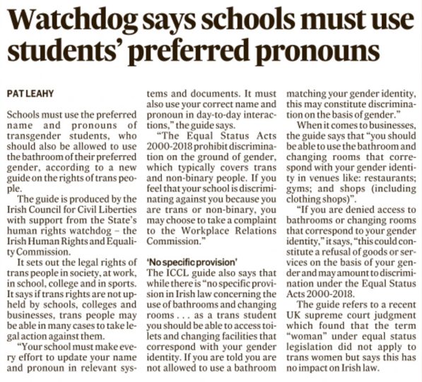 As a postscript this morning we learnt in another story from Pat Leahy that the Department has confirmed that there's no obligation on schools to use preferred pronouns as stated in the ICCL guide.