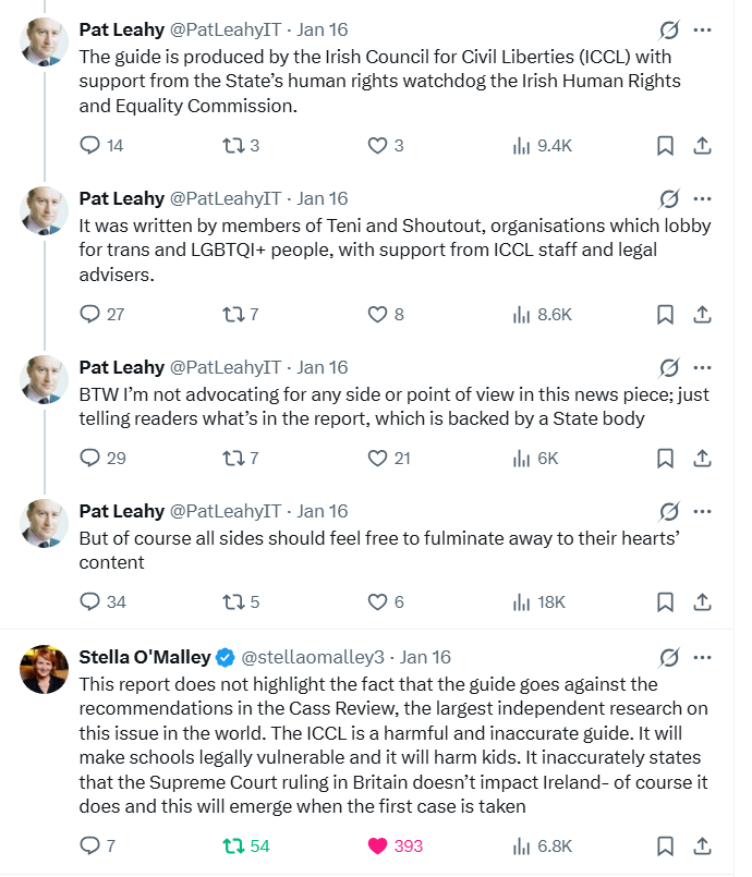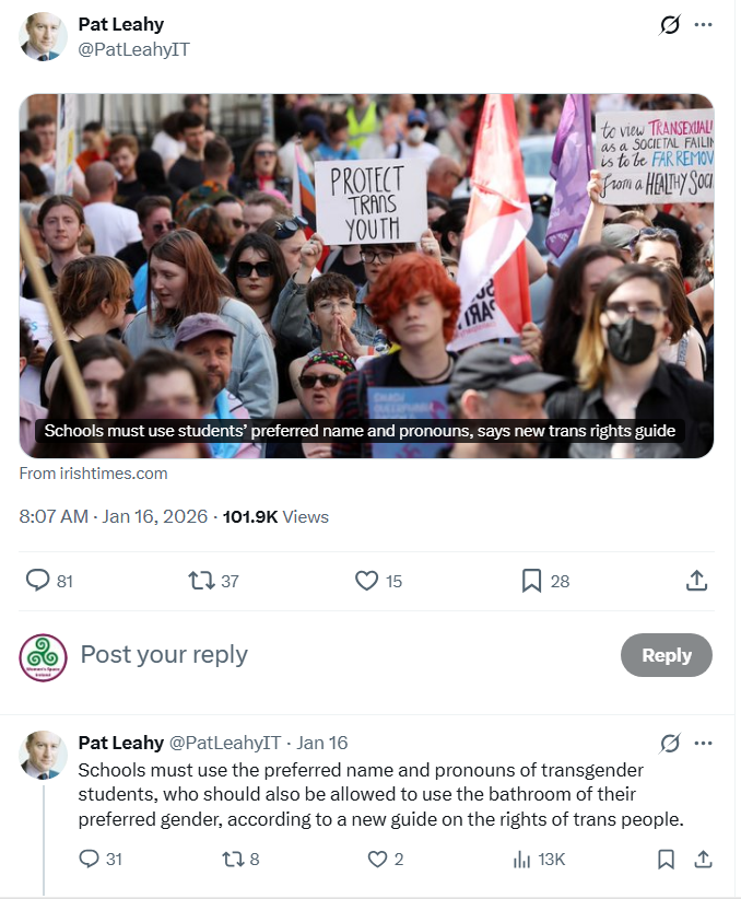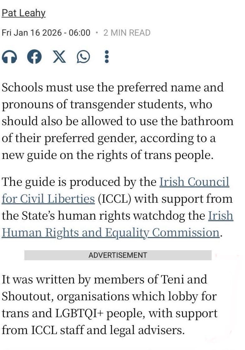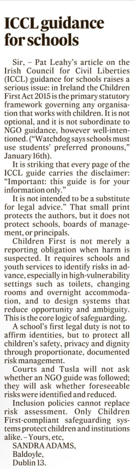 Gript reported of the GLEN (Gay and Lesbian Equality Network) "Being LGBT in School" which includes some worrying aspects regarding "social transitioning" by a school despite the warning in the Cass interim report and the suggestion that an "affirmative" approach by a school is legitimate despite Article 42 of the Constitution: