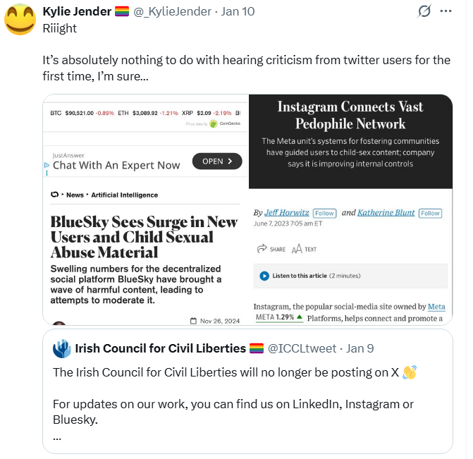 On January 9th the ICCL announced that it was leaving Twitter/X (as did the IHREC a day earlier.) Despite the clutching at pearls over Grok one person responded: